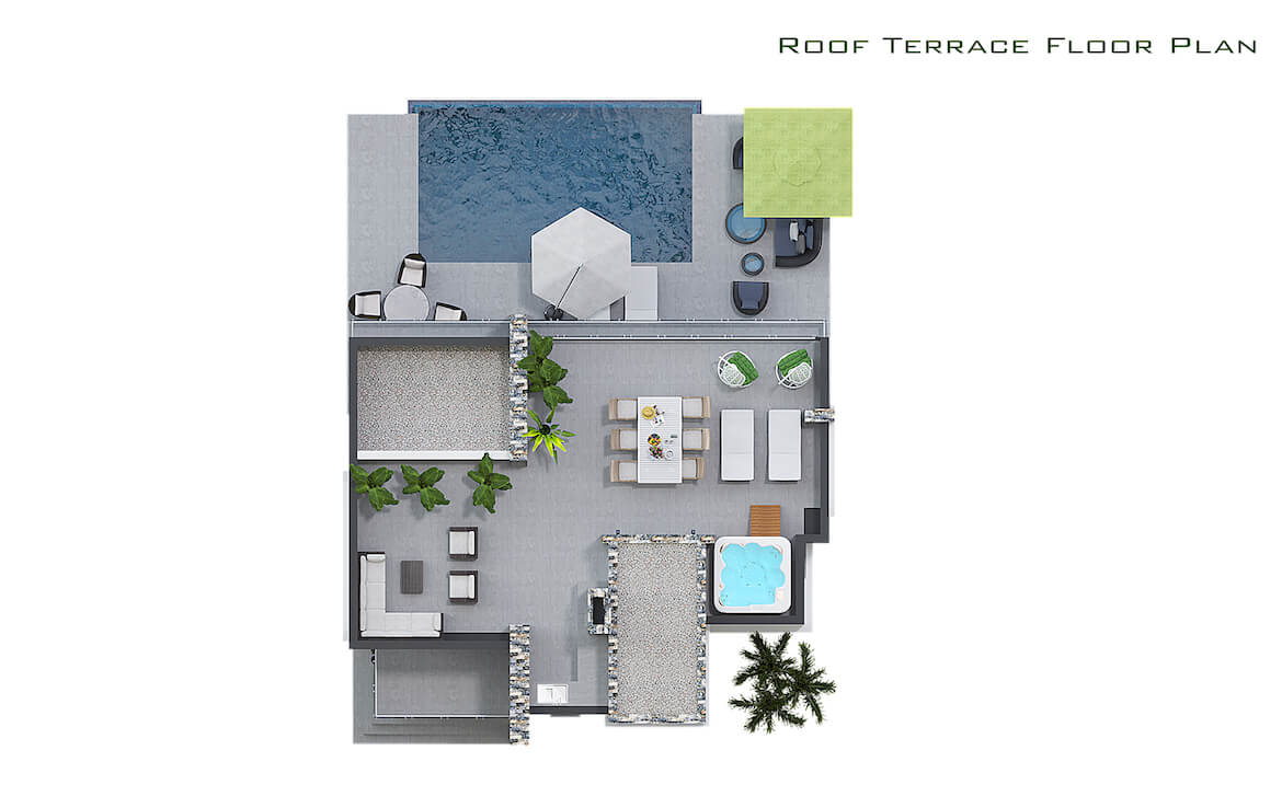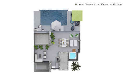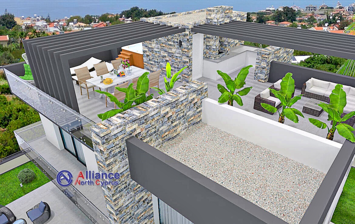 Roof - summer kitchen and barbecue area, seating areas, pergolas, jacuzzi.