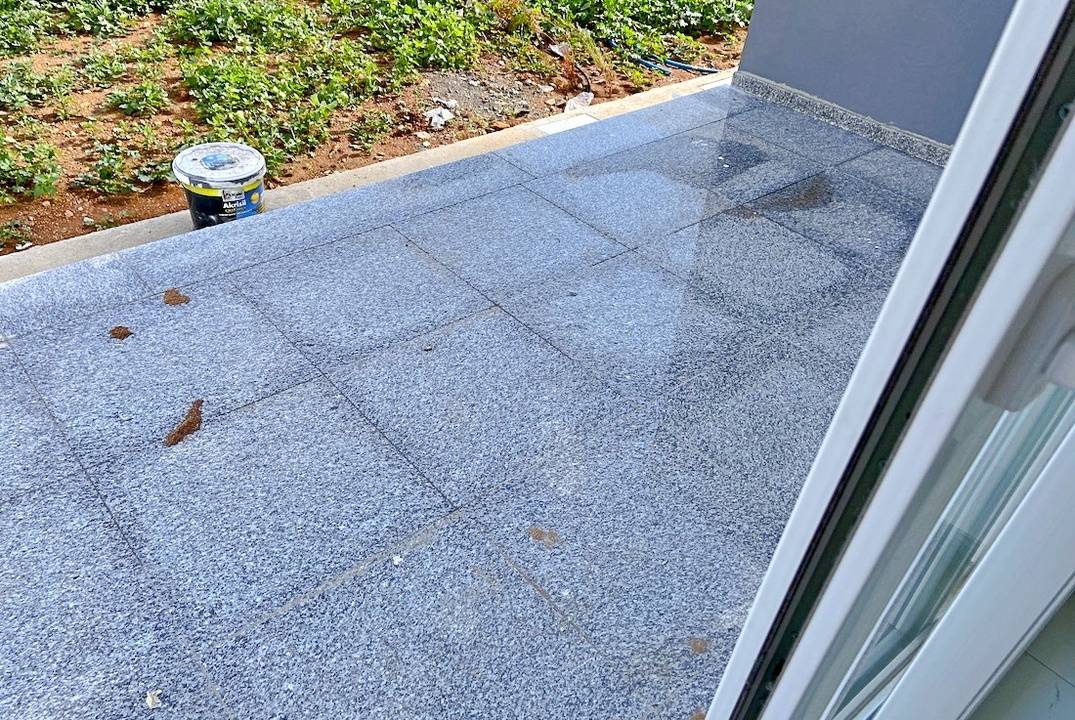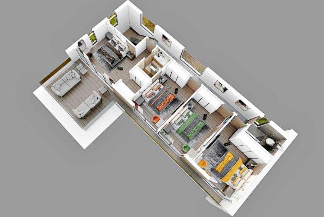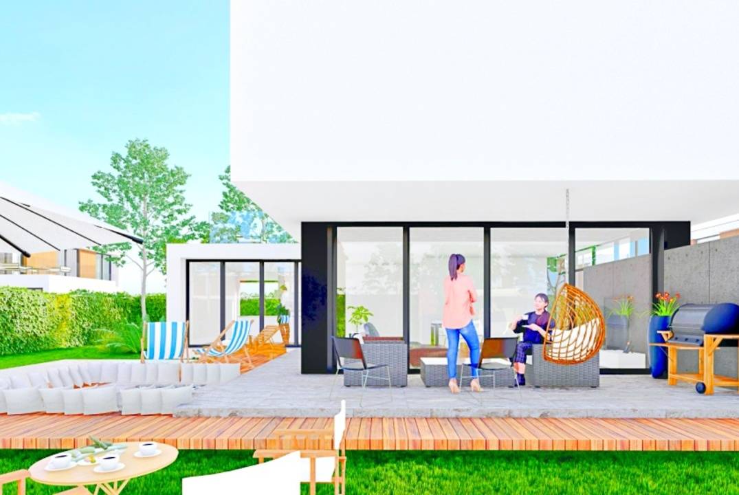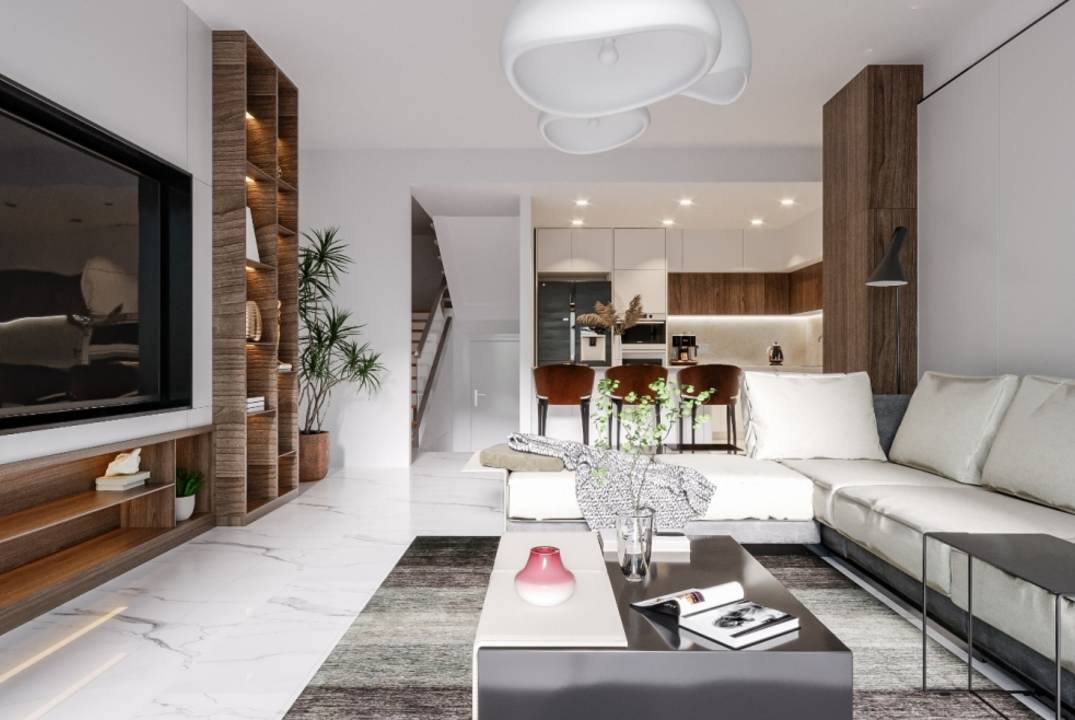 The townhouse for two families offers a comfortable life on three levels - a living room and kitchen area on the first floor, two bedrooms on the second and a spacious terrace - on the third.
