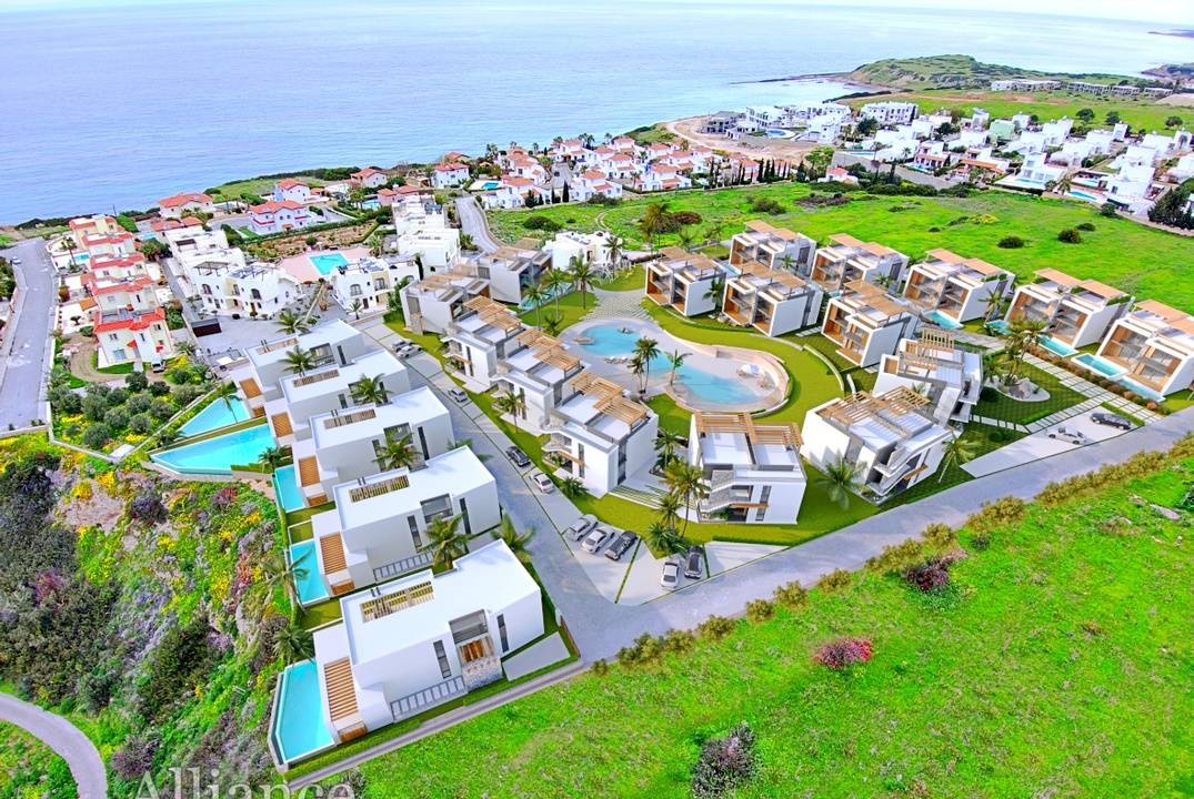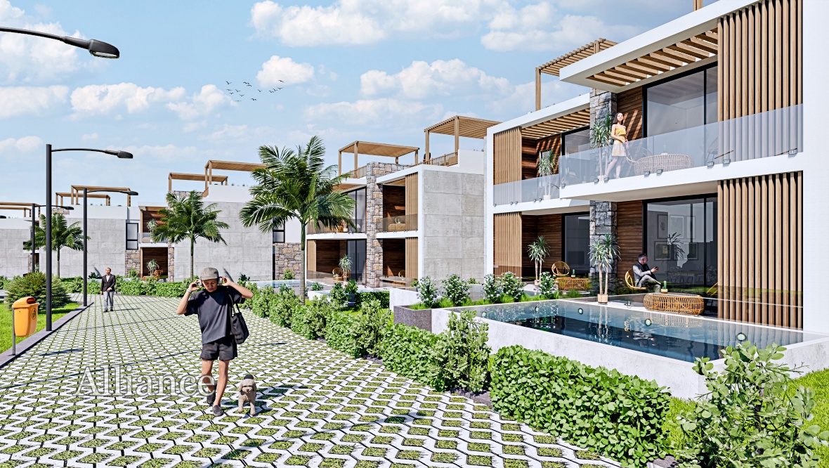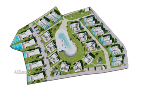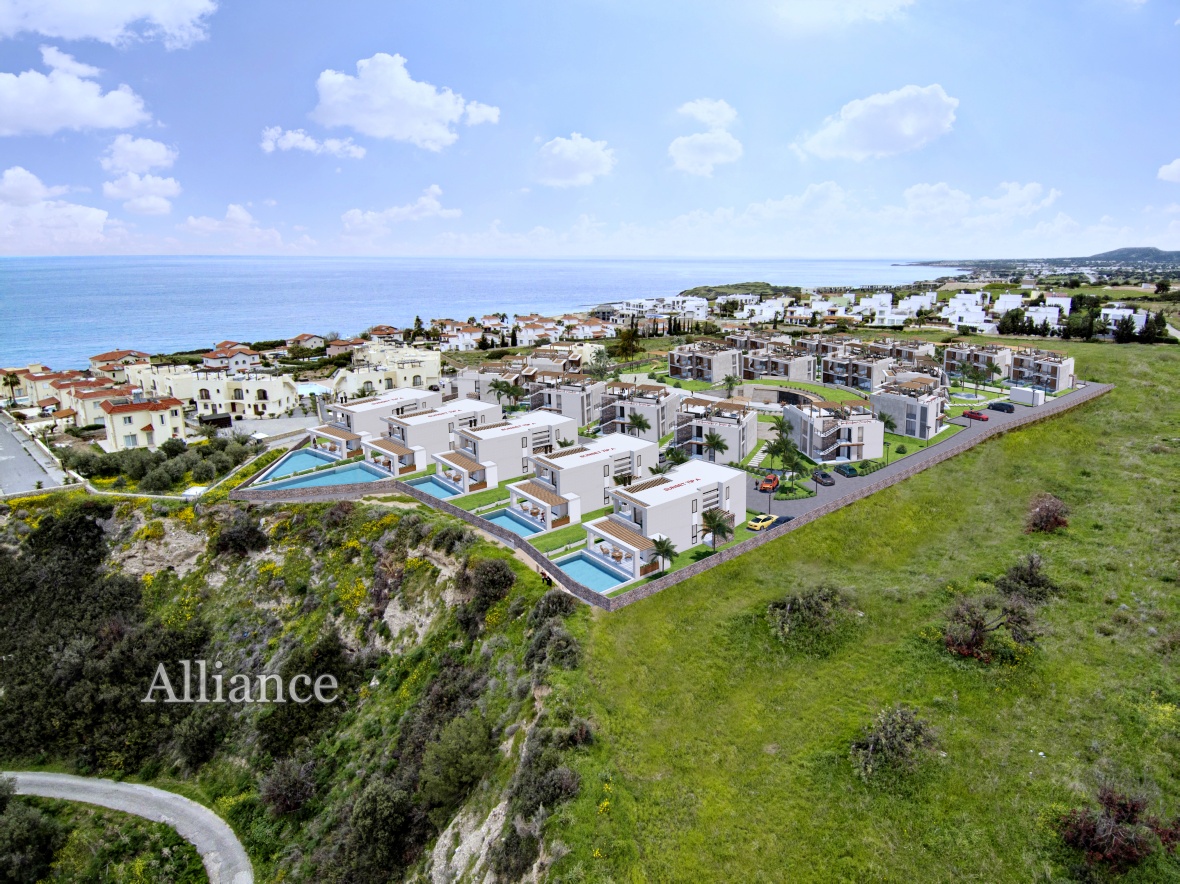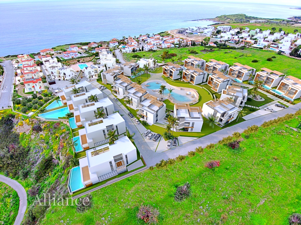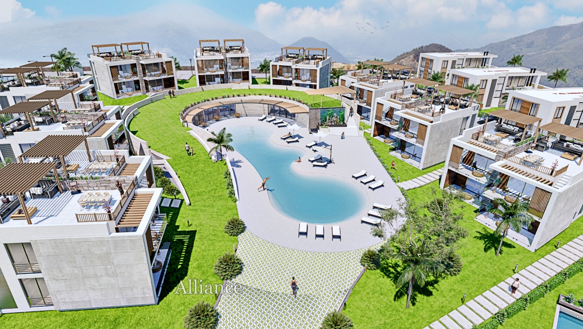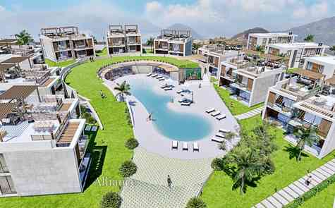 In a new residential complex, which is located in a beautiful place in Bahceli, there are options for everyone - individual villas with a pool, villas for two owners, and apartments with a shared pool. Surrounding the large communal pool are modern one and two bedroom apartments with a choice of floors, while the two-family villas have the option of a private pool. There are also individual villas with private pools. The seashore is located within walking distance, and there are cafes, restaurants, a shop nearby.