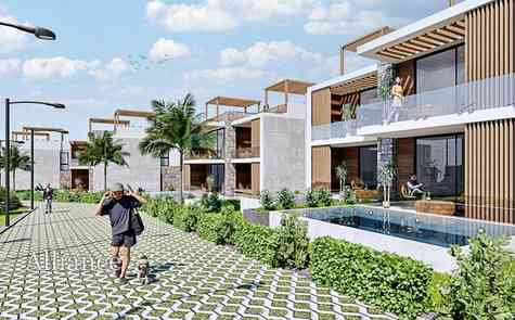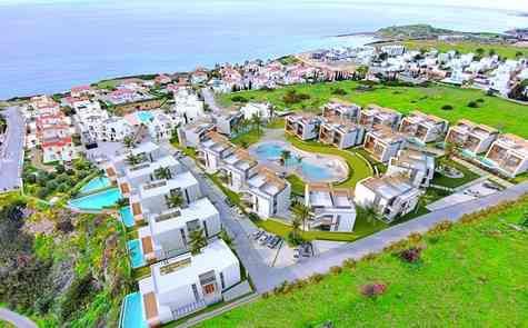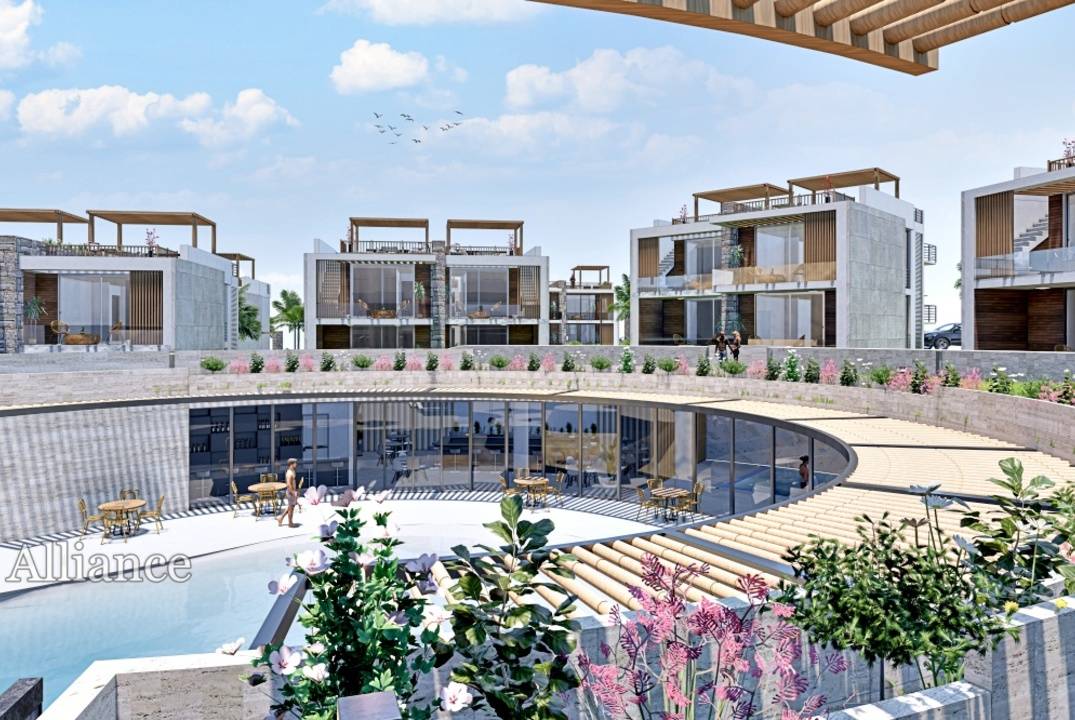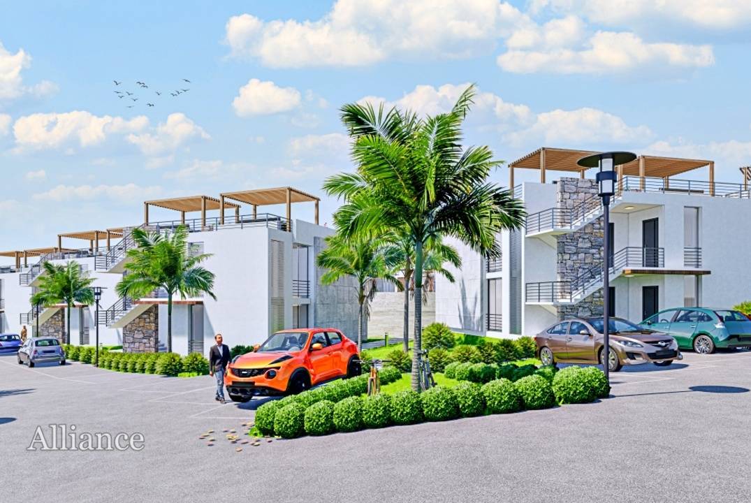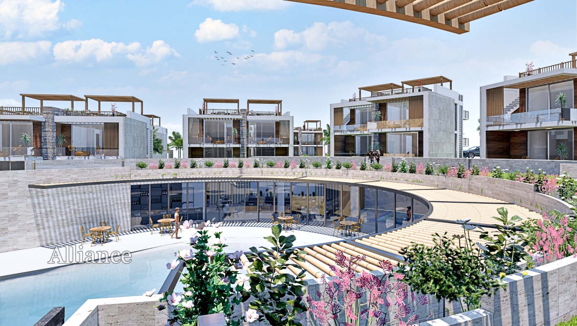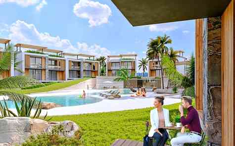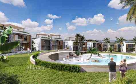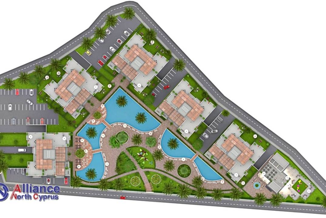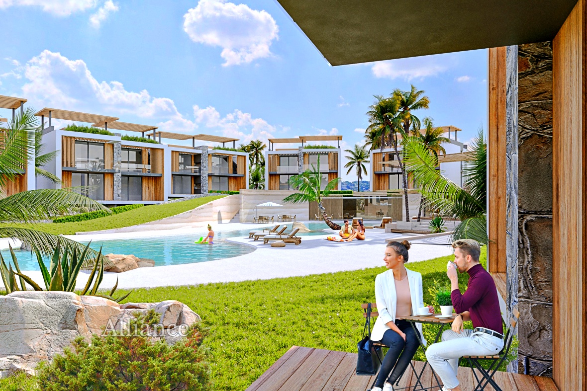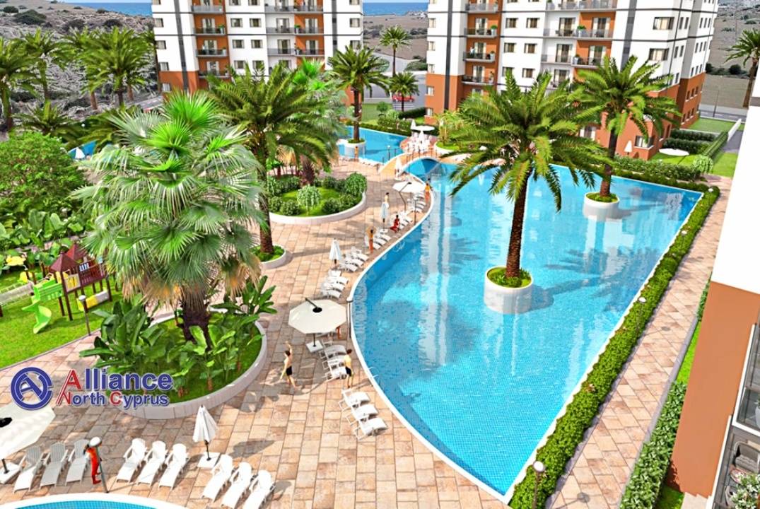 In a new residential complex, which is located in a beautiful place in Bahceli, there are options for everyone - individual villas with a pool, villas for two owners, and apartments with a shared pool. Surrounding the large communal pool are modern one and two bedroom apartments with a choice of floors, while the two-family villas have the option of a private pool. There are also individual villas with private pools. The seashore is located within walking distance, and there are cafes, restaurants, a shop nearby.