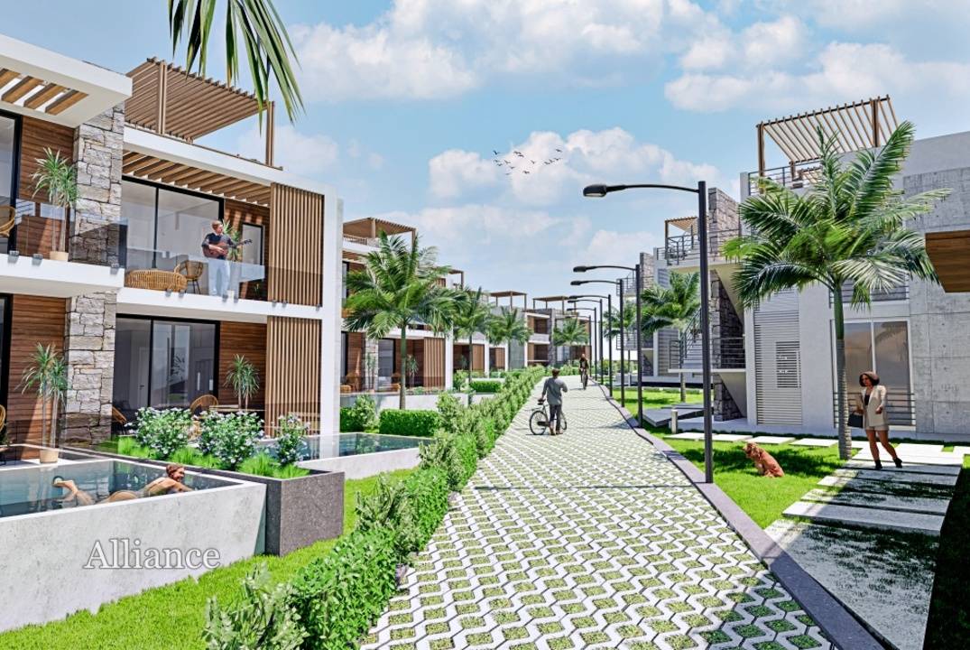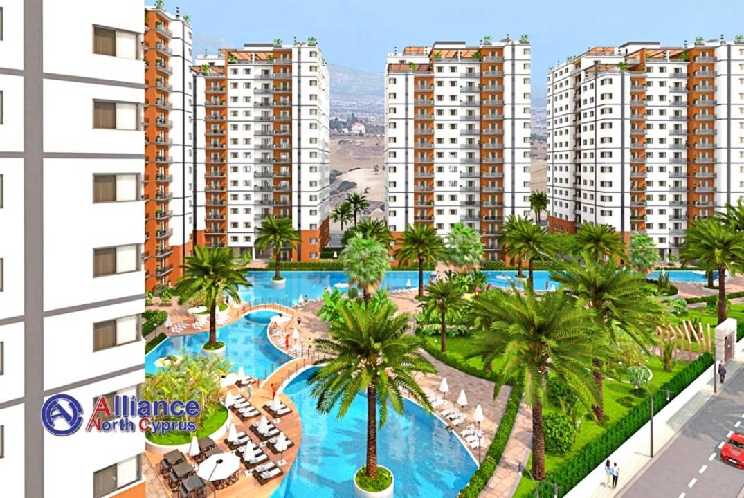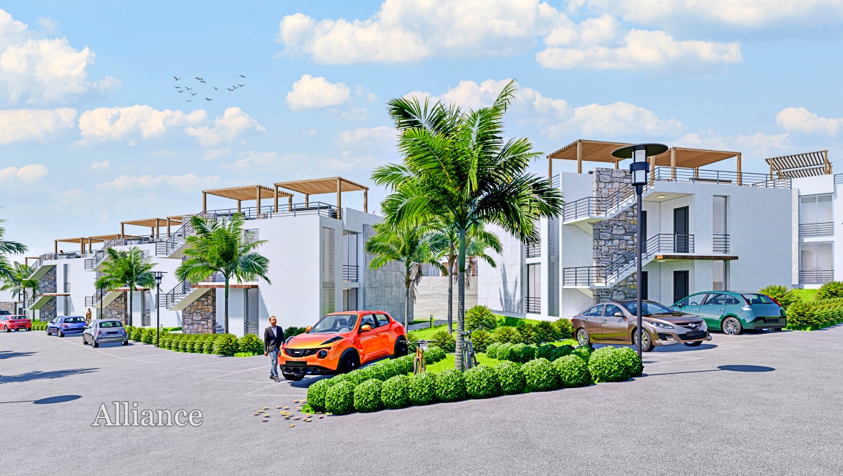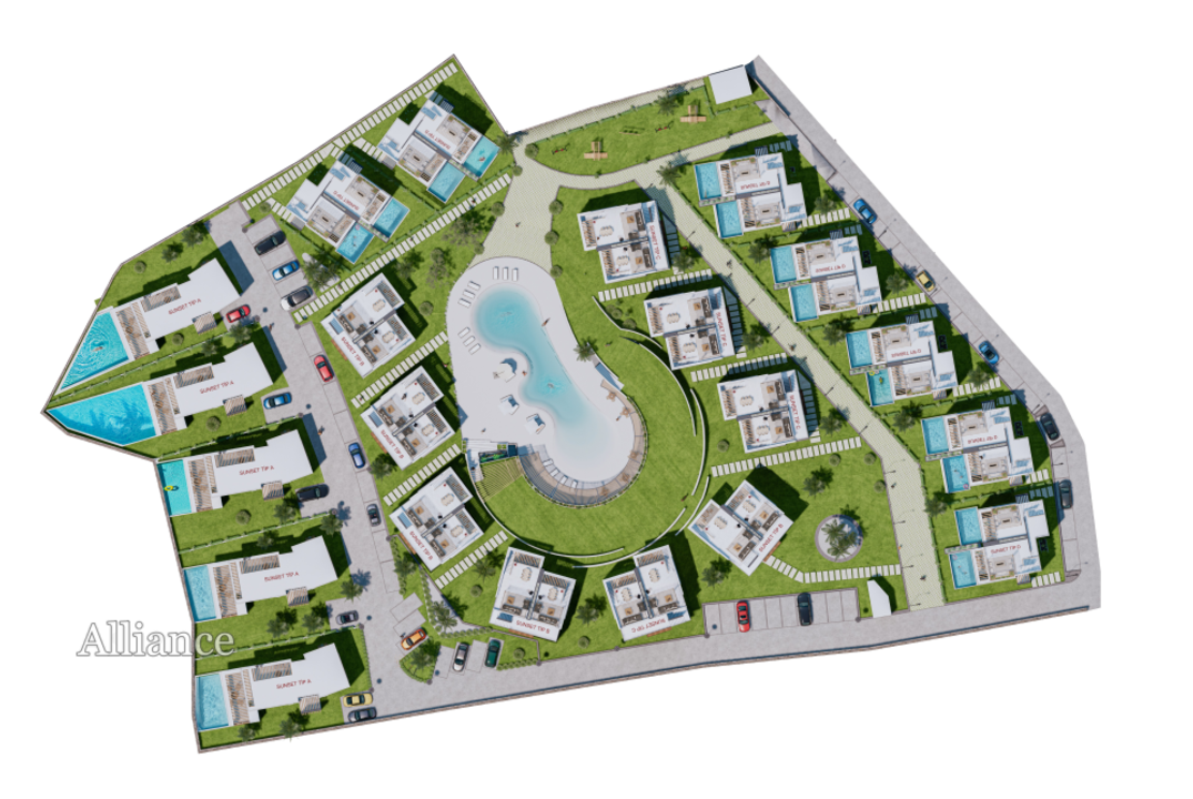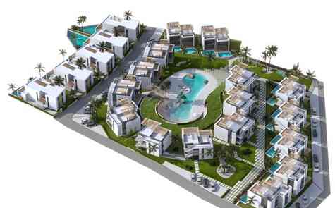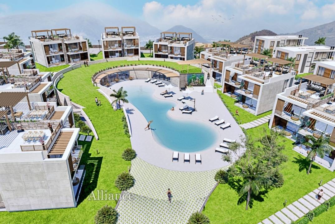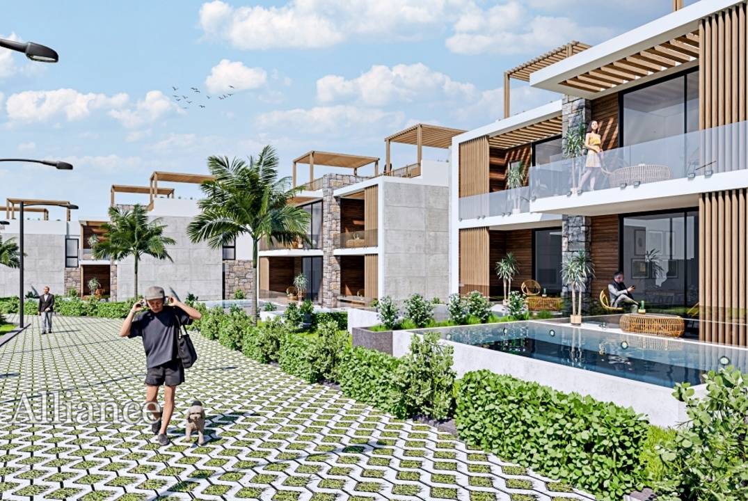 In a new residential complex, which is located in a beautiful place in Bahceli, there are options for everyone - individual villas with a pool, villas for two owners, and apartments with a shared pool. Surrounding the large communal pool are modern one and two bedroom apartments with a choice of floors, while the two-family villas have the option of a private pool. There are also individual villas with private pools. The seashore is located within walking distance, and there are cafes, restaurants, a shop nearby.
