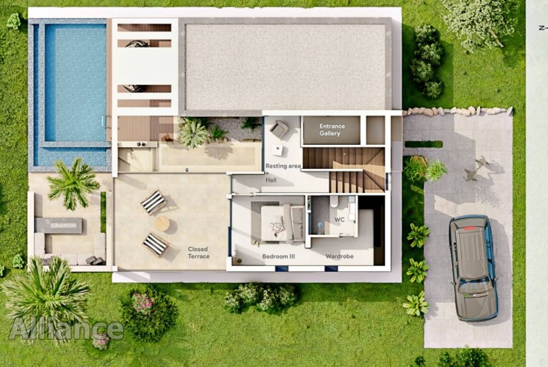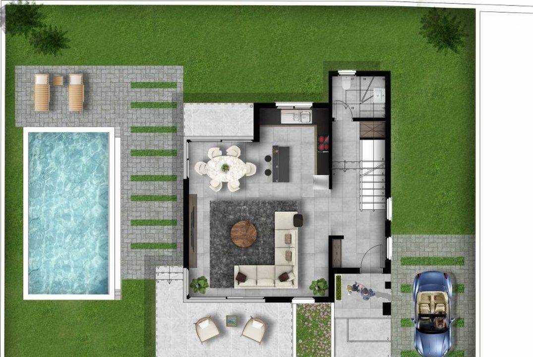 The villa has three bedrooms, four bathrooms, two living rooms, an indoor garage, a private pool, a garden. The villa is sold with all electrical appliances, blinds, curtains, unfurnished.